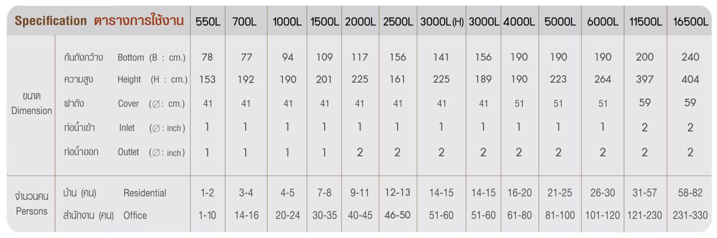2. รุ่น (ลิตร) 550, 700, 1000, 1500, 2000, 2500, 3000H, 3000, 4000, 5000, 6000, 11500, 16500